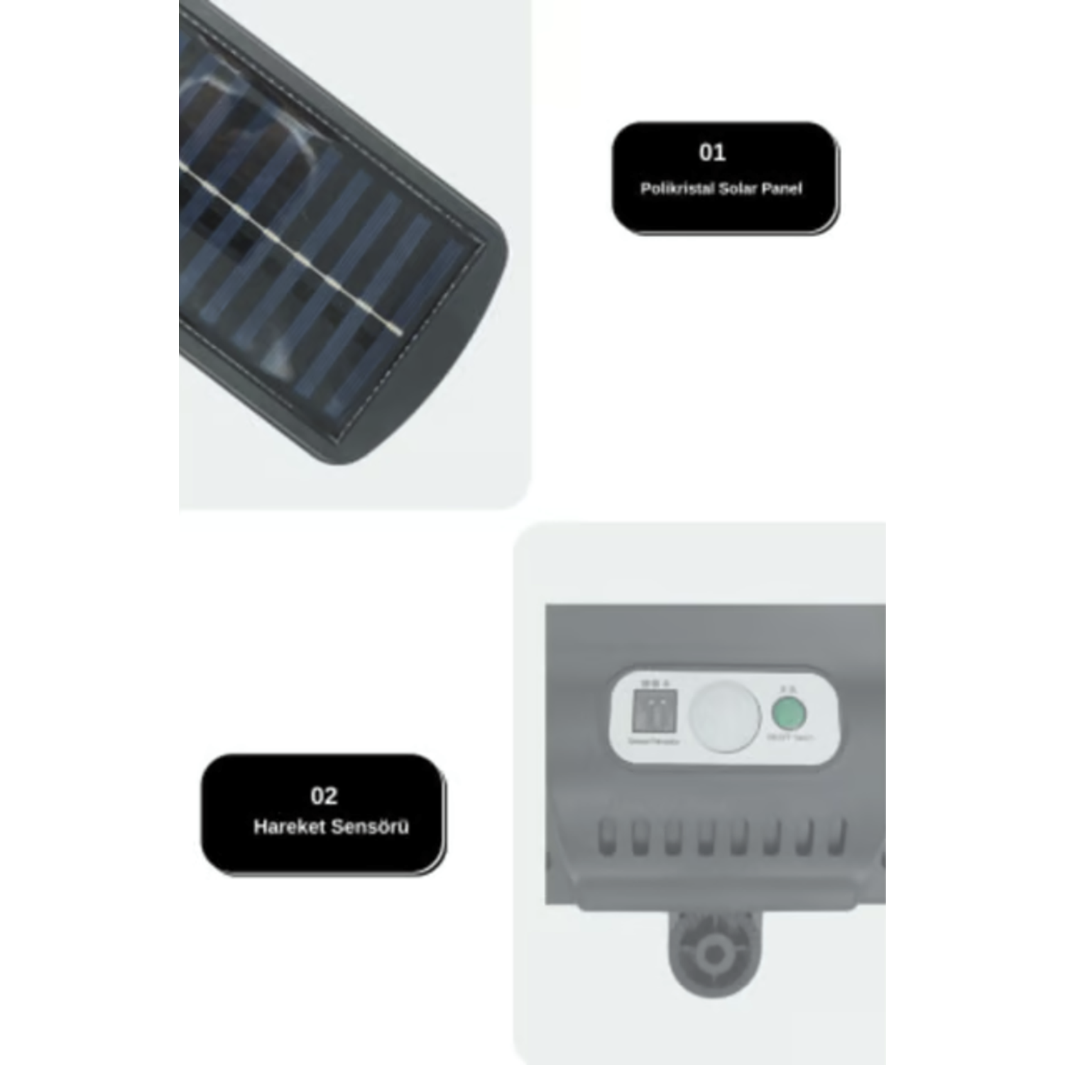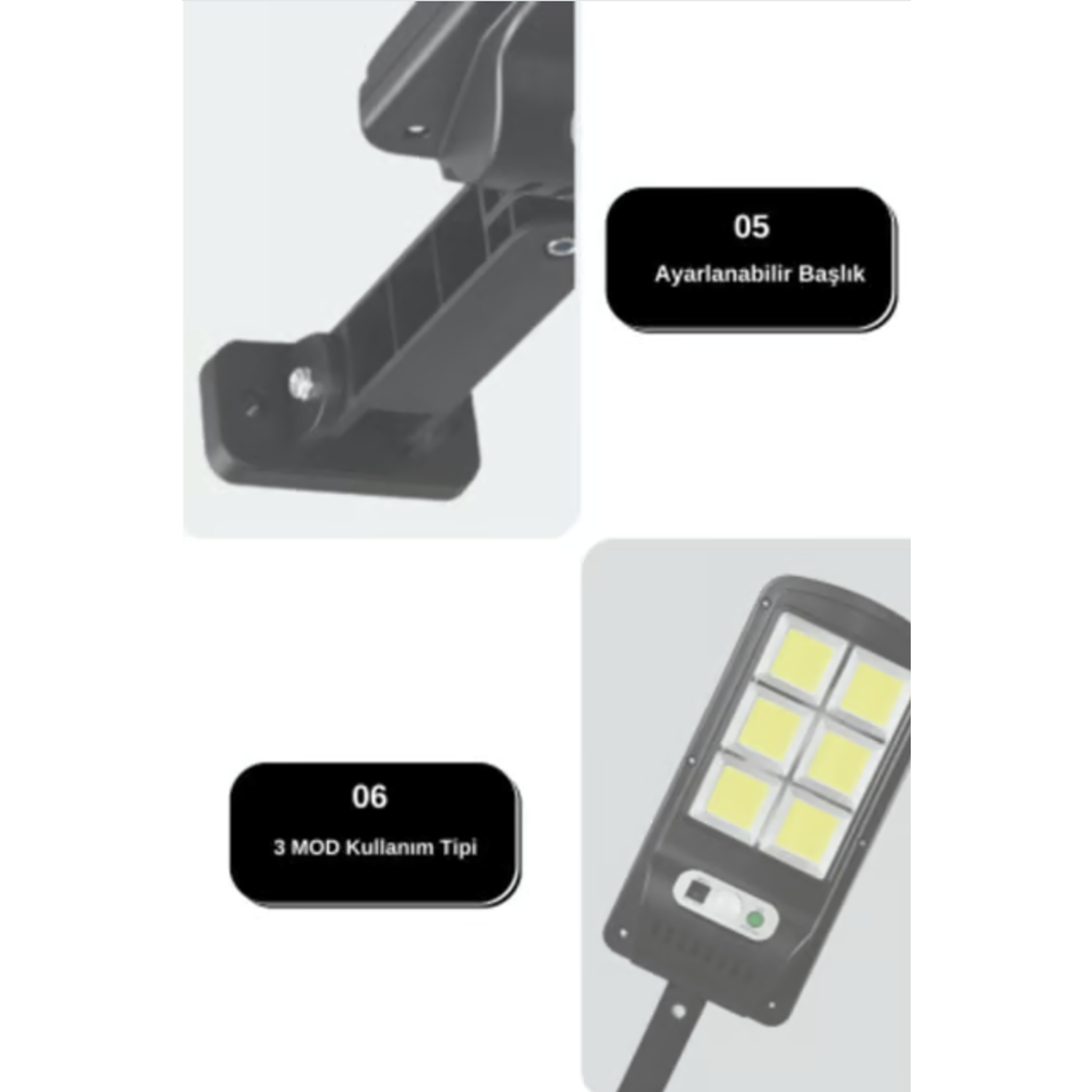 Ürünümüz gün ışığından aldığı enerji ile çalışmakta olup yaz kış kullanıma uygundur.; Çevre dostudur ve düşük maliyetli bir aydınlatma çözümüdür.; Güneş enerjisi kullanarak çalıştığı için elektrik faturasından tasarruf sağlar.; Kesintisiz enerji kaynağına sahip olduğu için elektrik kesintisi durumunda bile çalışmaya devam eder.; ; Hareket sensörlüdür.; ; Ürün rengi siyahtır.; ; Ürün güçlü aydınlatmasıyla öne çıkmaktadır.; ; Ürünümüz sudan etkilenmez tüm dış cephe kullanımına uygundur.; Bahçelerde, teraslarda, balkonlarda veya açık hava etkinliklerinde kullanılabilir.; ; Kurulumu kolaydır, yer değiştirmek istediğinizde kolayca taşıyabilirsiniz.; ; Ürün güvenlidir.; Ürün elektrik enerjisi kullanmadığı için, elektrik çarpması riski yoktur.; ; Solar aydınlatmaların verimliliği, güneş ışınlarının miktarına ve kalitesine bağlıdır.; ; Ürünümüz 3modda çalışmaktadır; ; * 1.ModSadece hareket halinde aktif hale gelir.; ; * 2.Mod Hareket halinde Parlak bir şekilde yanar, hareket olmadığı zaman Karanlık moda geçer ve kısık modda yanmaya devam etmektedir.; ; * 3.Mod Hareket olup olmadığına bakmaksızın sürekli kısık modda yanmaktadır.; ; Ürünün sensör açısı 120 derecedir ; Montaj aparatları kutunun içinden çıkmaktadır.; ; Pili 1200mA’dir ; Aydınlatma rengi beyazdır ; Giriş voltajı: 3.7V ; Şarj süresi 6-8 saat ; Çalışma saati 8 saatten fazla ; Koruma sınıfı: IP65 ; Malzeme: ABS ; Gücü 15W ; Lümen 500 lm ; ;