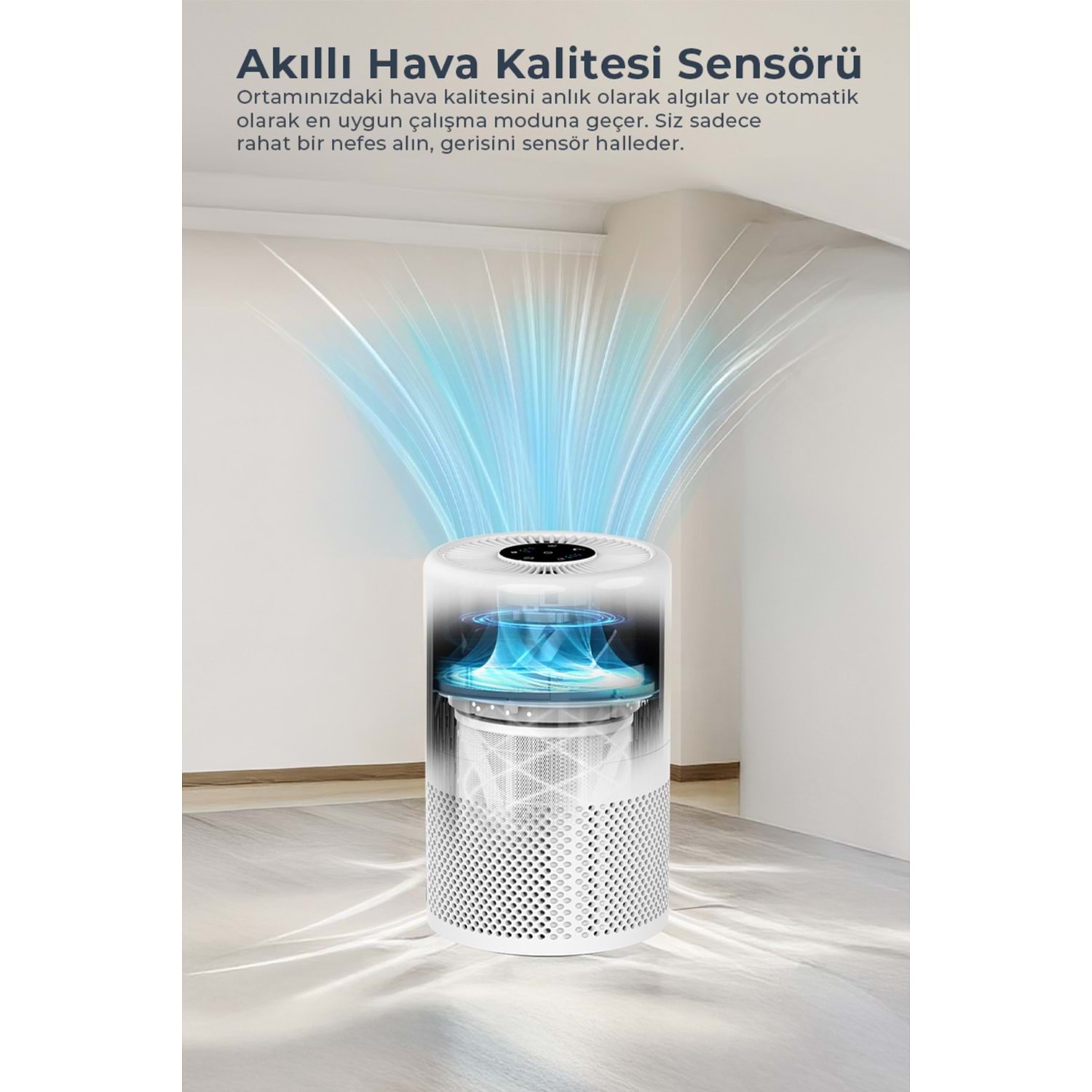 Gelişmiş 3 kademeli HEPA H13 filtreleme sistemi ile evinizdeki havayı toz, polen, duman ve kötü kokulardan arındırarak %99.97 oranında temizler. 120 m³/saat CADR performansı ile yüksek verim sunar. Akıllı hava kalitesi sensörü ve 3 renkli LED göstergesi sayesinde ortam havasının durumunu sürekli takip edebilirsiniz. Uyku modu ile gece boyunca sessiz ve konforlu bir kullanım sağlar. Zaman ayarlı otomatik kapanma, filtre değişim uyarısı ve çocuk kilidi gibi güvenli ve pratik özelliklerle donatılmıştır. Şık ve kompakt tasarımı ile evinize modern bir dokunuş katarken, düşük enerji tüketimiyle ekonomik bir kullanım sunar.