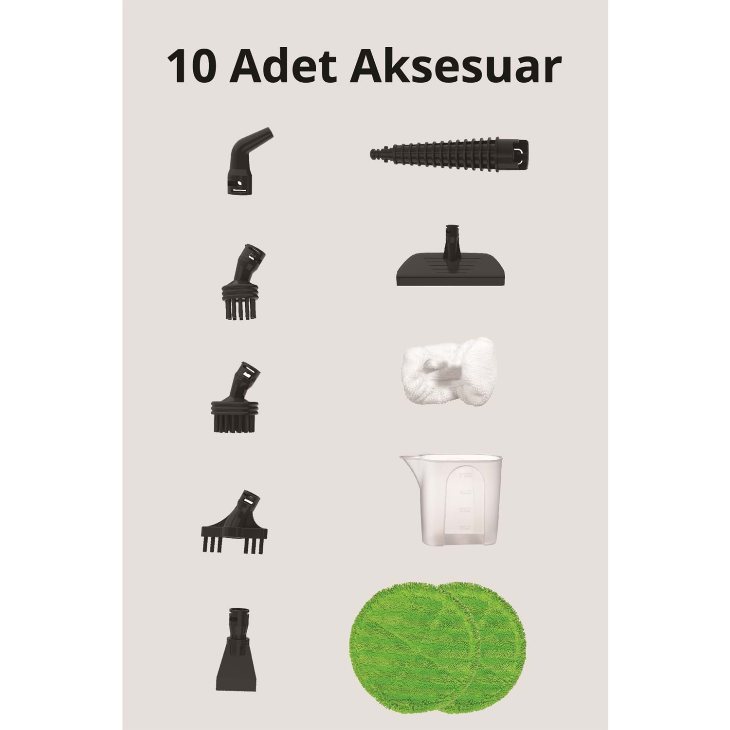 Aksesuarlar; Dairesel çift malzemeli paspaspedi, Kavisli başlık, Büyük yuvarlak fırça, Dar alan temizleme, Cam kazıyıcı,Kazıyıcı başlık, Küçük yuvarlak fırça, Havlu seti, Doğrudan inanma, Ölçümkayıtları