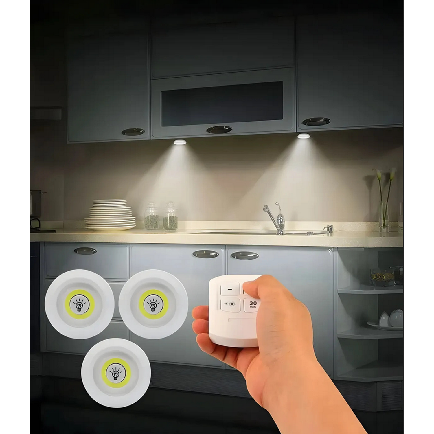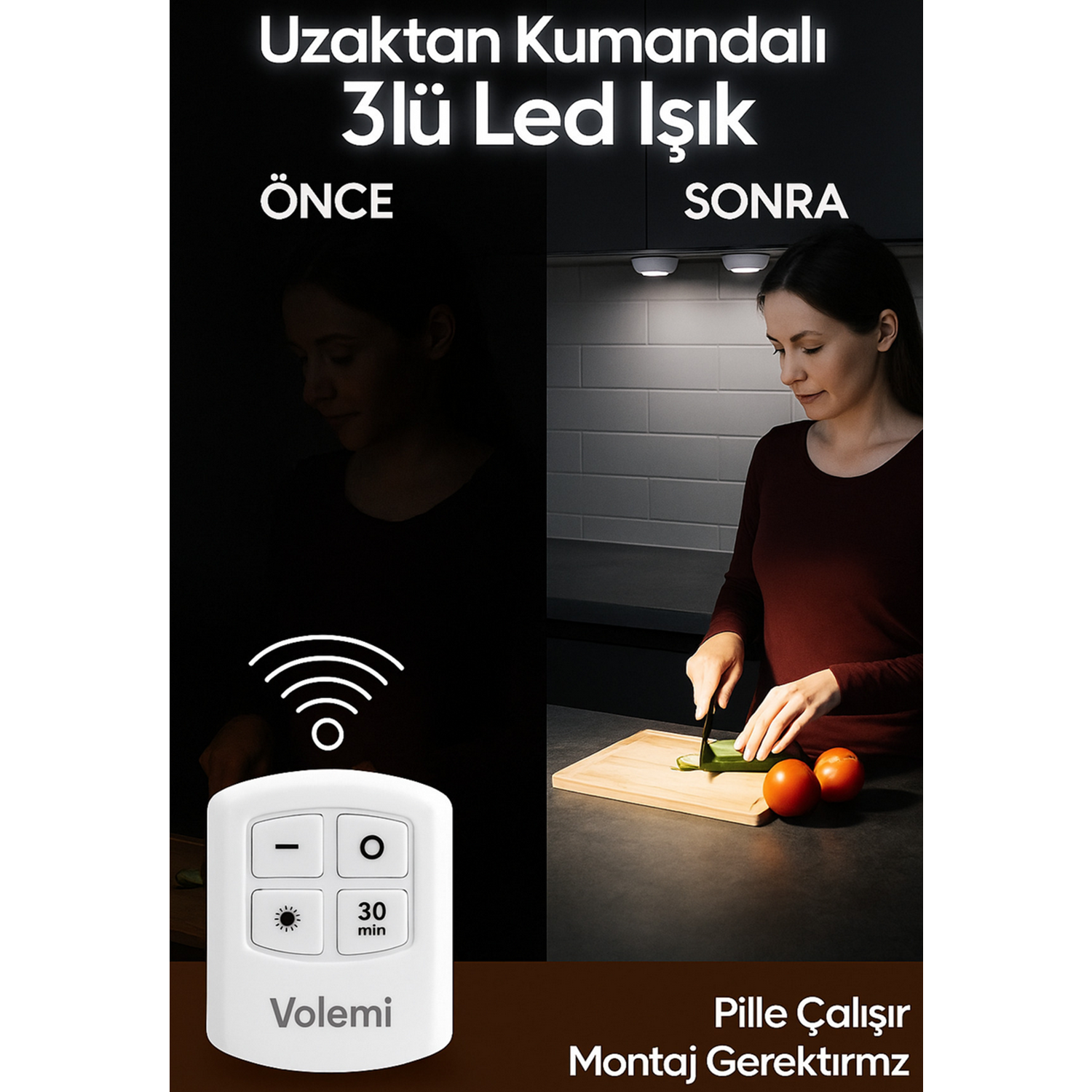 Teknik Detaylar: • Set İçeriği: 3 Adet LED ışık, 1 Adet uzaktan kumanda • Güç Kaynağı: Her ışık için 3 AAA pil (toplamda 9 pil gerekir, piller dahil değildir) • Işık Tipi: COB LED • Montaj: Yapışkan bant ve vida seçenekleri mevcut • Zamanlayıcı: 30 dakika otomatik kapanma fonksiyonu • Renk: Beyaz • Kullanım Alanları: Mutfak, dolap içi, vitrin, kitaplık, gardırop, ve daha fazlası.