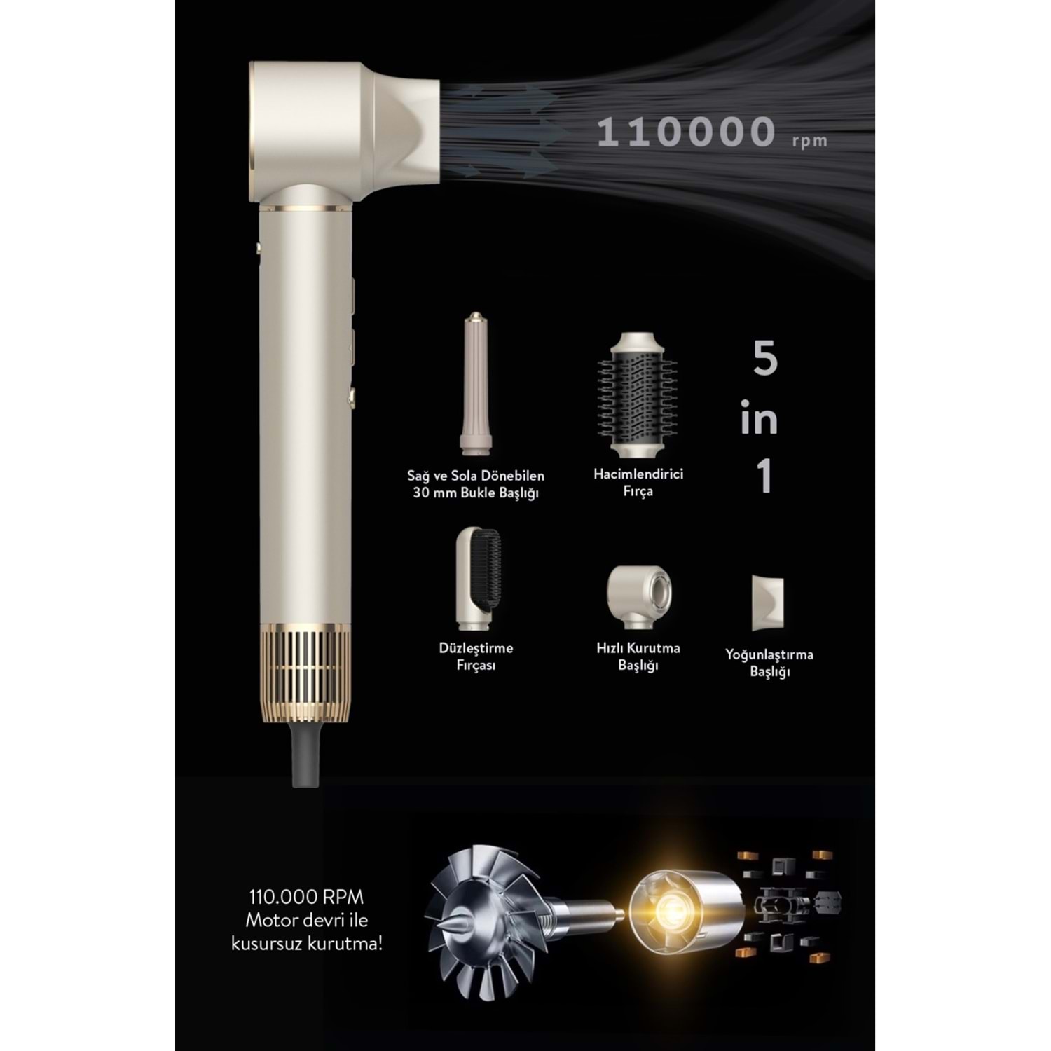 6'sı 1 Arada Çok Fonksiyonlu Saç Kurutma ve Şekillendirme Cihazı: 110.000 RPM –1600W 600 MİLYON NEGATİF İYON Saç kurutma, düzleştirme, bukle yapma, dalgalandırma, hacim kazandırma ve tarama işlemlerini tek cihazla sunar.
