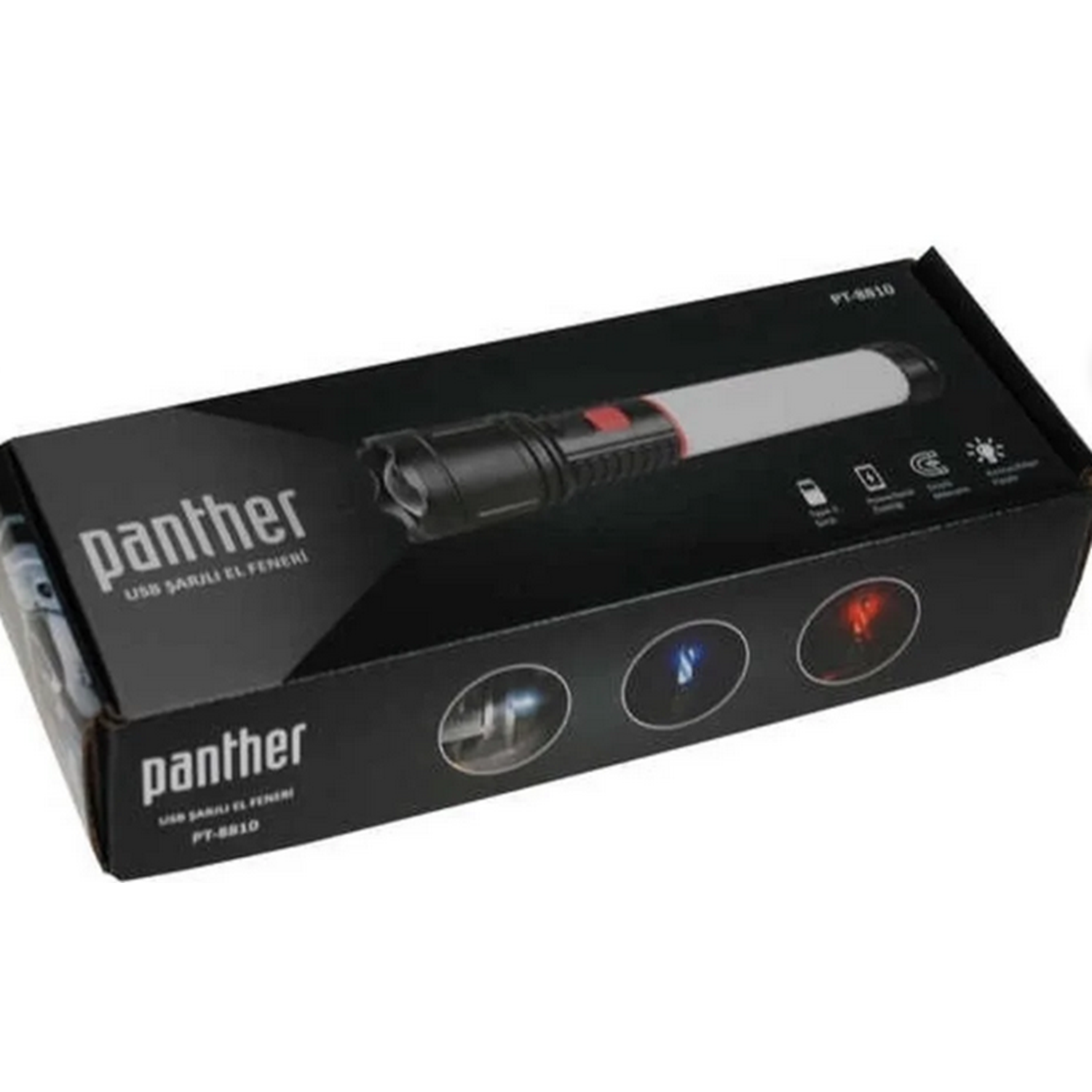 PANTHER PT-8810 USB ŞARJLI EL FENERİ Özellikler: Ön Led: Çok Işık, Orta Seviye Işık, Flaşör Yan Led: Beyaz Işık, Kırmızı Işık, Mavi Işık, Kırmızı-Mavi Flaşör Max 800 Lumen Zoom Güçlü Mıknatıs 1 adet 18650 2000 mAh Pil USB Input/Output Girişi 5V Type C USB Kablo ile şarj olur.