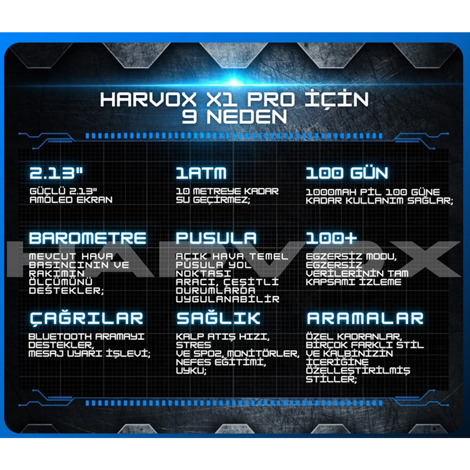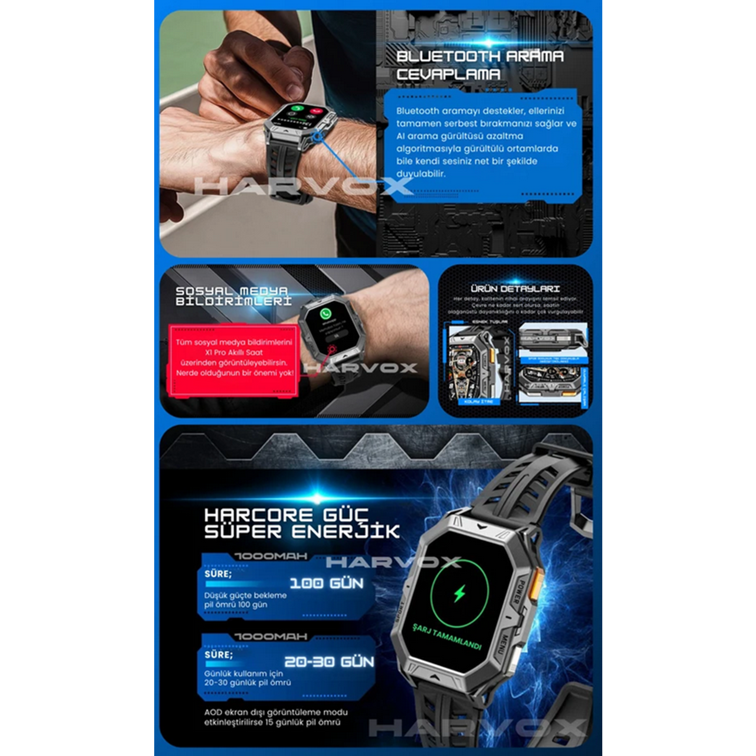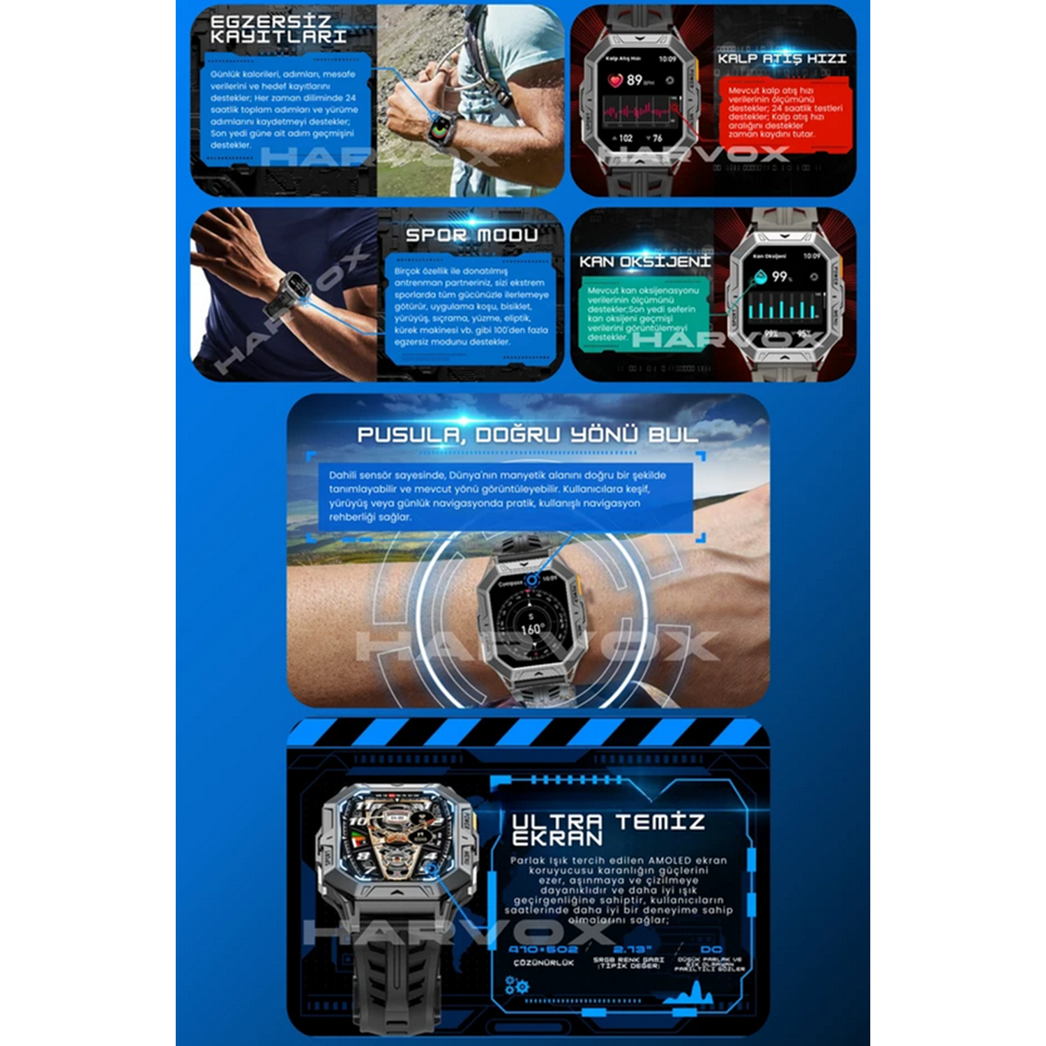 2.13" inç amoled ekran Tüm akıllı telefonlara uyumlu Yapay zeka desteği Birbirinden şık kadran çeşitleri Türkçe dil desteği Saat üzerinden telefon görüşmesi yapılabilmektedir. Gelen aramayı cevaplayabilir ve saat üzerinden telefon görüşmesi yapabilirsiniz. Sms bildirimleri, whatsa bildirimleri ve sosyal medya bildirimlerini ekranda görebilir ve ek içeriklerini okuyabilirsiniz. Arayüz ekleme özelliği nabız ölçer, tansiyon ölçer, kalori ölçer (referans değer bildirir, tıbbi değer olarak kabul edilemez.) Adımsayar, kalori tüketimi, egzersiz kilometre kaydı müzik çalar kontrolü uyku takibi Anti-Kayıp hatırlatma çağrı hatırlatma desteği Alarm, takvim, kronometre 100 farklı spor modu Tam dokunmatik ekran, 2.5d yüzey kapasitif tam uyum dokunmatik, amoled ekran Değiştirilebilir kordon sayesinde her zaman ilk gün ki gibi kullanım ve her kombine özel uyum imkanı sağlamaktadır.